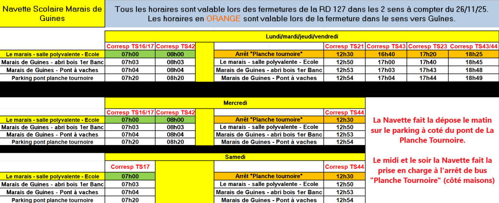 Une navette de liaison entre le Marais de Guînes et la Planche Tournoire sera mise en place dès le 26/11 jusqu’au 06/12 inclus pour les scolaires afin de faire des correspondances avec les Transports scolaires (TS).