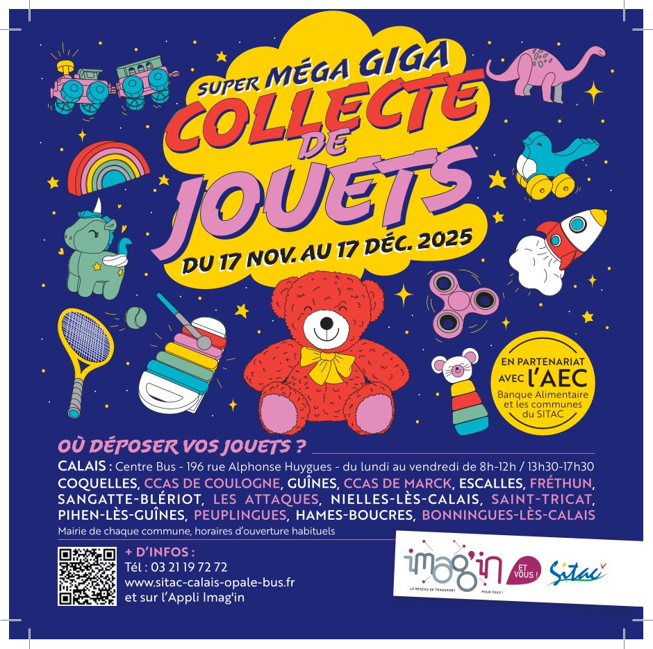 De nombreux points de collecte sont disponibles à Calais et dans les Communes alentours, alors n’hésitez pas à déposer vos jouets en bon état dans votre Mairie, CCAS ou au Centre Bus.