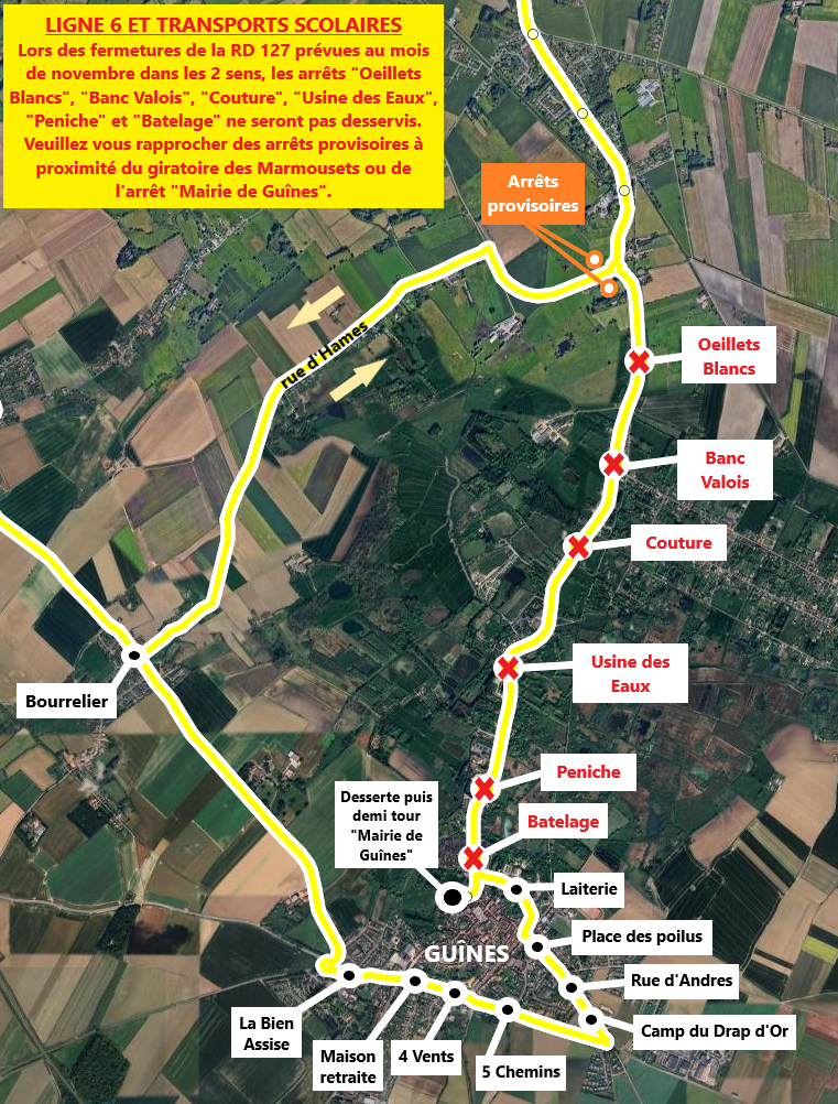 Veuillez vous rapprocher des arrêts provisoire sur la D 305 (à proximité du giratoire des Marmousets) ou de l’arrêt « Mairie de Guînes ».