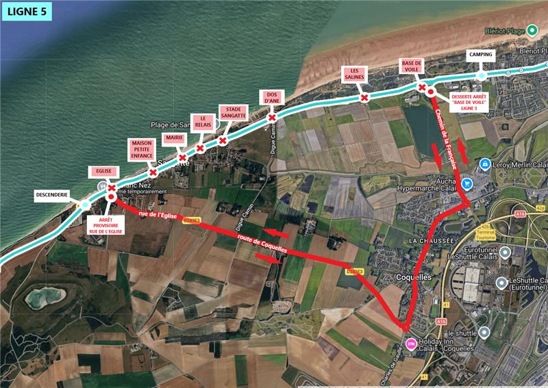 • « Base de Voile », « Les Salines », « Dos d’Ane », « Stade de Sangatte », « Le Relais », « Mairie », « Maison Petite Enfance » et « Eglise ».